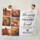 Una manta de tributo al Personalizado mascota con un elegante fondo de mármol, un collage de seis fotos de tu querido animal, una cita de simpatía que dice "tu vida fue una bendición, tu memoria un tesoro, te aman más allá de las palabras y te extrañan más allá de toda medida", una letra de pata con un corazón de amor, el nombre de tu perro o gato y su fecha de nacimiento o muerte. Esta moderna manta conmemorativa de animales es fácil de personalizar, y es el regalo perfecto de solidaridad para usted, su familia o amigos para honrar a esos mascotas especiales que ya no están con nosotros.