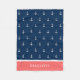 Manta de estilo náutico con un patrón de anclaje blanco con un color de fondo editable, haga clic en el botón personalizar para obtener acceso. Para cambiar el color azul, seleccione el color de fondo y cambie su color. Para cambiar el color de coral, seleccione una capa rectangular y cambie su color. Personalízalo reemplazando el texto del marcador de posición con su propio texto. Para obtener más opciones, como cambiar el tipo de letra y su tamaño/color o el espaciado entre letras, haga clic en el botón "Personalizar". *Tenga en cuenta que la marca de agua Zazzle que aparece en la vista previa del zoom NO aparecerá en el producto impreso final. © Rosewood y Citrus