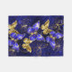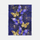 Composición de lujosas mariposas de zafiro y joyas de oro sobre fondo de textura azul.