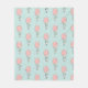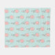 Una manta con un caprichoso conejo blanco sosteniendo un gran globo rosado flotando en el aire.