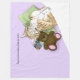 Una mesa naranja durmiendo sobre una almohada con una manta morada detrás, oso de peluche y juguete de pescado.