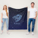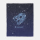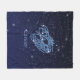 Una manta de fleece con el símbolo de Cáncer en azul plateado suave, cubierto con las estrellas de la constelación, contra un fondo estrellado del cielo clasificado de azul oscuro a negro.