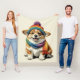 Una blanda y acogedora manta con un adorable cachorro de corgi con expresión feliz, con un gorra vibrante y colorido y una bufanda a juego. ¡Ideal para añadir calidez y amabilidad a cualquier espacio!