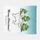 El personalizado original de Destei ilustracion de un lindo perro de raza Golden Retriever de color crema inglesa. El perro es colocado en una escena de invierno frío. En la escena está nevando en el fondo y hay tres abetos verdes detrás del perro. Los árboles tienen algo de nieve sobre ellos. El fondo es un gradiente azul claro a blanco que da a este diseño un aspecto frío de invierno. También hay un área de texto personalizable que ahora dice "¡Feliz Navidad!" en un hermoso tipo de letra de guión. Bajo él hay otro área de texto personalizable para un nombre de familia u otro texto personalizado.