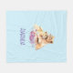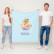 Una manta con una linda pintura acuarela de un león madre sosteniendo su cachorro de bebé. Un ramo de flores moradas de bonito debajo de ellas aporta un toque agradable a esta imagen dulce y adorable. Fondo azul claro.