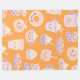 Adorables dibujos a la kawaii de bebidas y postres de tarta de calabaza otoño y otoño en lavanda pastel, lilac y rosa sobre un fondo naranja de temporada.