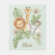This charming, personalized blanket features four cute, friendly baby safari animals—a giraffe, a lion cub, a baby elephant, and a monkey—peeking out from a lush backdrop of soft green tropical jungle leaves and dried palm fronds. This gender-neutral, soft-toned art is ideal for jungle nursery decor orbaby shower gifts.