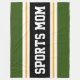 Este diseño deportivo, atlético, presenta texto en negrita SPORTS MOM dentro de una banda ancha negra resaltada con doble franjas de carreras blancas y amarillas contra rayas exteriores verdes forestales. El texto de este diseño se puede personalizar.