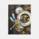 Diales antiguos con artes de oro y latón, decorados con libélula mecánica sobre fondo marrón, rayado. Steampunk.