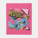 Diseño de boombox de estilo retro colorido con decoración de texto "Music", formas geométricas, triángulos, rectángulos y formas redondeadas a rayas
