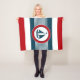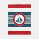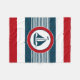 Diseño náutico con decoración de velero en forma redonda sobre fondo rayado azul, rojo y blanco