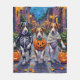 El admirable Jack Russells vestido con juguetones disfraces de Halloween lleva cubos de calabaza mientras truco o truco bajo el cielo iluminado por la luna. Este diseño festivo resalta la animada postura de la raza, sus ojos brillantes y su personalidad enérgica, capturando a la perfección la atmósfera espeluznante y divertida de la noche de Halloween. Una alegre celebración para los amantes del perro y los fans de Halloween.