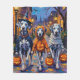 Adorables dálmatas vestidos con juguetones disfraces de Halloween llevan baldes de calabaza mientras truco o truco bajo el cielo iluminado por la luna. Este diseño festivo destaca el abrigo característico de la raza, los ojos brillantes y la personalidad animada, capturando perfectamente la atmósfera espeluznante y divertida de la noche de Halloween. Una encantadora celebración para los amantes del perro y los fans de Halloween por igual.