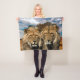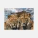 Dos leones salvajes en fondo africano de la sabana y el cielo azul con las nubes blancas que dibujan y paisaje africano típico. Usted puede personalizarla con su nombre o dejarla en blanco