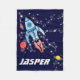 Niños de la marina azul espacial con manta de cohetes. Personalice con el nombre o apodo de su hijo hasta 6 letras. En este ejemplo se lee Jasper. Diseñado e ilustrado exclusivamente por Sarah Trett para www.mylittleeden.com en zazzle.