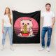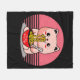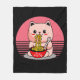 Ilustracion colorido de un gato kawaii lindo y rosa comiendo ramen de un tazón rojo sobre un fondo de sol rosado a rayas
