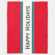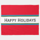 Las famosas pinstripes azul y verde alpino de "caramelo de cinta" resaltan los hermosos "FERIADOS FELICES" dentro de una amplia franja blanca central con tipografía negra moderna. Las amplias franjas coloreadas de color rojo intenso encima y debajo completan la composición.