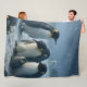 Scription wrap yourself in the wonders of the wild with this cozy emperor penguin family fleece blanket this high detail horizontal design features a huddle of majestic emperor penguins and they're adorable fluffy chick braving a gentle Arctic snowfall in the Misty distance a curious polar bear watches on completing this serene Antarctic scene made from soft warm fleece. This blanket is perfect for winter snuggling adding a nature inspired touch to a nursery