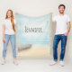 Una manta con una hermosa imagen rústica. Tonos sutiles de azul claro, marrón arenoso y blanco suave. Escena de playa con un barco a orillas del mar con una red de pesca colgando de un lado. Una elegante mirada de mal gusto.