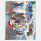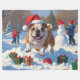 Una ilustración navideña conmovedora que presenta a un perro alegre jugando en la nieve, usando un sombrero de Santa y rodeado de cajas de regalos coloridas. En el fondo, los niños construyen un muñeco de nieve junto a un árbol de Navidad cubierto de nieve, creando un invierno mágico y alegre. Perfecto para difundir la alegría navideña y capturar la magia de la Navidad.