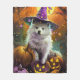 Admire el espíritu de Halloween con este diseño encantador que presenta un perro lindo en un gorra de brujas rodeado de calabazas talladas. Perfecto para añadir un toque de encanto espeluznante a sus celebraciones festivas.