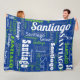 Celebra a tu equipo deportivo con este estadio de estadio de estadio de estadio de estadio con nombres repetidos, azul y verde, con tipografía moderna en tonos azul deportivo, verde deportivo, blanco y gris deportivo con tus nombres en una variedad de fuentes diferentes. Un gran regalo para el amante de los deportes de Seattle, o para la ducha de bebé y el recién nacido de una familia deportiva. Esta manta es perfecta para llevarte en las noches frescas en el campo deportivo. Por favor, envíeme un mensaje si necesita ayuda con alguna personalización para sus nombres, o los colores de su equipo deportivo!