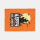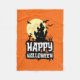 Feliz ilustracion de diseño de texto de Halloween con decoración de casa embrujada, cementerio y murciélagos en luna llena sobre fondo naranja de grano