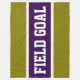 This sporty design features athletic FIELD GOAL text inside deep purple, white, and golden olive stripes. The text can be personalized.