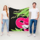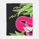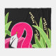 Arte de flamingo rosa estilizado sobre fondo negro con follaje verde decorativo