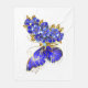 Joyería, azul, zafiro, mariposa floral brillante con ala decorada con flores azules y preciosas con hojas de oro sobre fondo blanco.