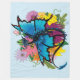 dragón negro y azul con alas de mariposa azul enclavado en un ramo de flores de colores en un fondo azul claro
