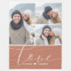 Esta manta de felpa de diseño único presenta 3 de tus fotos favoritas en una cuadrícula con un bloque sólido de rosa polvorienta con amor en letra script y sus nombres debajo.