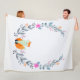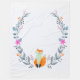 Una manta de lana de Fox con un zorro lindo sentado entre una corona de bonito con flores y hojas. Colores de lila, azulina, rosa, roja y blanquecina.