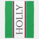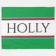 Este diseño festivo incluye texto HOLLY dentro de una amplia franja blanca central realzada con pinstripes negras, amarillas y naranjas contra rayas exteriores brillantes de color verde kelly.