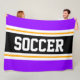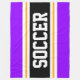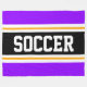Este diseño deportivo, atlético, presenta texto en negrita SOCCER dentro de una banda ancha negra realzada con doble franjas de carreras blancas y amarillas contra rayas exteriores violetas brillantes. El texto se puede personalizar.