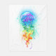 Grandes medusas de azulejo brillantes, de dibujos artísticos, con largos tentáculos en blanco, pintadas con fondo multicolor de acuarela. Mariscas arcoiris.