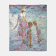 A mother, sunhat gently tilted, guides two children through a shimmering tidepool of color and light. They bend in curiosity, searching for sea-treasures beneath the ripples — shells, stones, maybe memories. The scene captures the innocence of childhood and the quiet strength of maternal presence. Waves glisten in hues of turquoise and lavender, while soft shadows dance in sun-washed sand. There's movement, but also stillness — like a moment suspended in warm salt air.