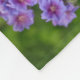 Un lindo gato bicoloro negro y blanco, European Shorthair, sentado en una silla de madera frente a flores violetas del jardín. Foto tomada por Katho Menden. Esta manta es un regalo para los amantes del gato.