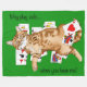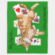 Un lindo gato de tabby naranja que cruza un juego de solitario en un fondo verde
