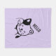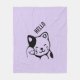 Una manta diseñada con el ilustracion de un gatito sonriente y ondeando con un manto negro alrededor de la oreja. Fondo del punto de polka morado. Simple lindo y adorable.