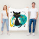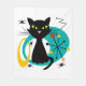 Ilustracion colorido de estilo abstracto de mediados de siglo con gato negro, estrellas negras y círculos coloridos decoración sobre fondo blanco