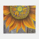 Representación abstracta estilizada de un girasol con líneas de barrido audaz y llamativos contrastes de color. El girasol, decorado en tonos dorados, amarillos y naranjas, se encuentra sobre un bonito fondo rústico de barnboard.