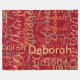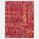 Agregue su propio nombre a la plantilla para crear un diseño de patrón sin problemas. Nombres con estilos de fuente y colores diferentes que se repiten por todo el fondo rojo.