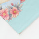 Una manta estampada con un diseño adorable con un ilustracion acuarela. Un globo de aire caliente decorado con flores rojas y rosas bonitos. Un lindo oso bebé blanco se sienta en la canasta. Fondo azul claro.