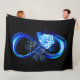 Luminous infinity symbol with glowing, beautiful, lushly blooming rose made of blue flames on black background.