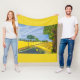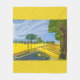 Golden Fields and Path captures a peaceful countryside road where vibrant yellow fields meet deep, long tree shadows under a soft blue sky.