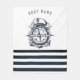 Esta imagen muestra un nombre de barco, rueda y ancla sobre un fondo de rayas azul marino y blanco.