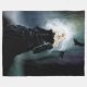 Mujer de cabello blanco con un hermoso vestido negro corseado victoriano gótico. Ravens, niebla y bosque a su alrededor.