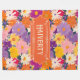 Este patrón brillante presenta un ilustracion de audaces flores violetas, amarillas, rosas, naranjas y cremas que se amontonan en un lienzo colorido.