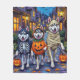 Los malamutas alasquenses adorables vestidos con juguetones disfraces de Halloween llevan baldes de calabaza mientras truco o truco bajo el cielo iluminado por la luna. Este diseño festivo resalta el grueso abrigo de la raza, la construcción fuerte y el espíritu aventurero, capturando a la perfección la atmósfera espeluznante y divertida de la noche de Halloween. Una deliciosa celebración para los amantes del perro y los fans de Halloween por igual.